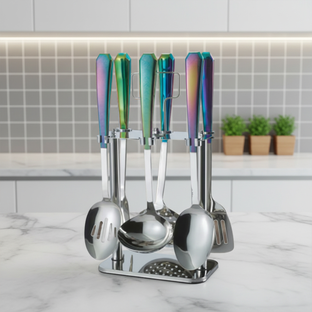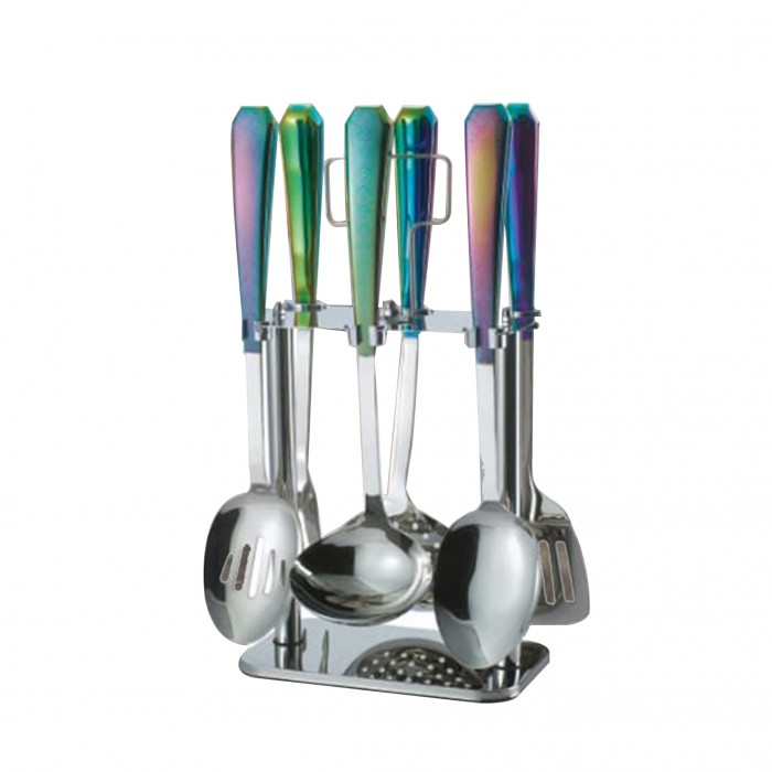 استانلس اللوان 7 قطع – قطعة غرف المكرونة الاسباجيتي- قطعة مغرفة حساء – ملعقة غرف – اسباتولا – ملعقة غرف دائرية بثقوب – شوكة – حامل للطقم