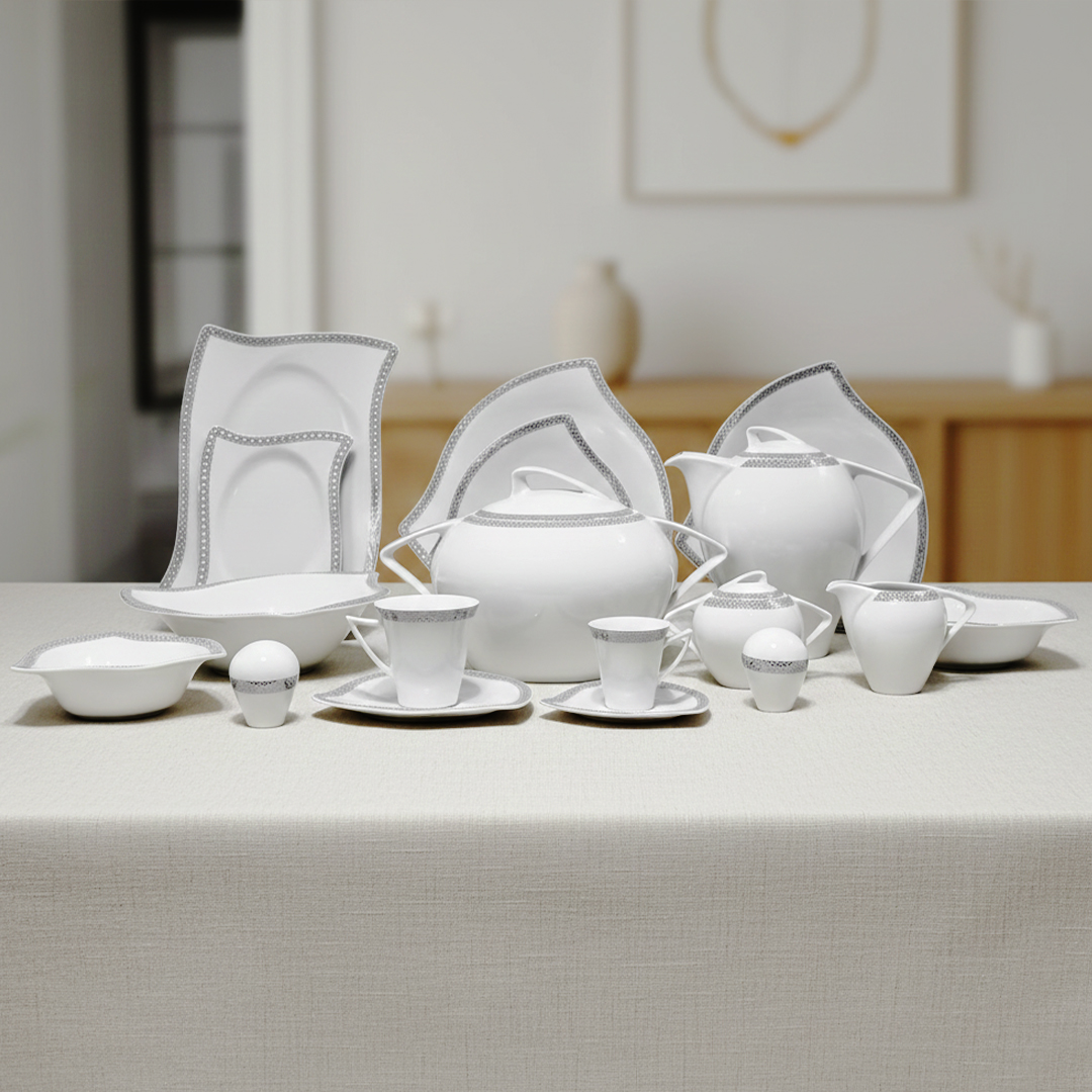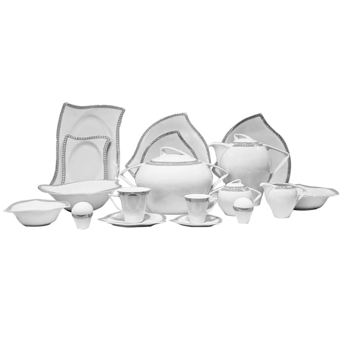 .6 طبق مسطح 27 سم .6 طبق غويط 23 سم .6 طبق جاتوه 21 سم .6 بولة شوربة 13 سم .2 سرفيس سلطة 23 سم .1 سرفيس 36 سم .1 سلطانية + 1 غطاء .1 شوبليت .1 سلاديرة .6 فنجان شاى + 6 طبق .6 فنجان قهوة + 6 طبق .1 براد لتر 1.6 + 1 غطاء .1 سكريه + 1غطاء .1 لبانة .2 ملاحة صنع فى مصر
